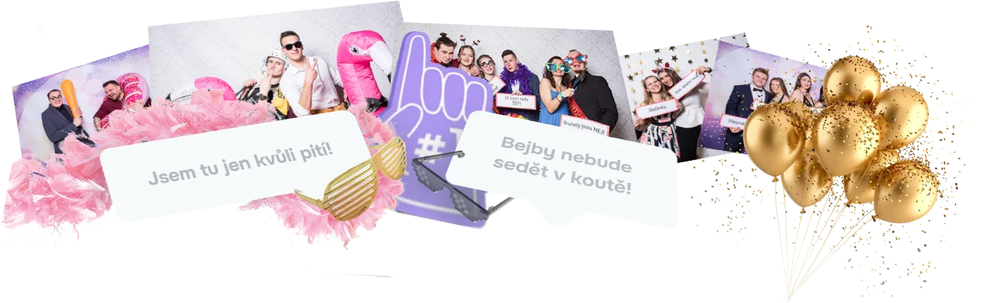 Máme kufry plné paruk, brýlí a hlášek, které akci rozjedou. Pozadí si vyberete z naší nabídky, ale rádi vám připravíme i něco speciálního – třeba firemní logo, svatební motiv nebo originální nápis. Univerzální cedulky s texty vyrábíme zdarma.
